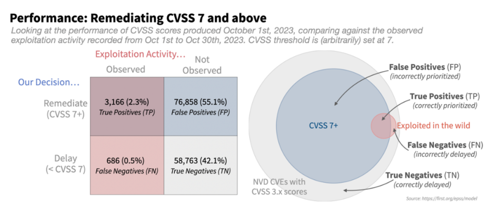 The diagram reveals that a mere 2.3% of the high-severity vulnerabilities (CVSS 7 or above) were exploited (True Positives). Surprisingly, most prioritized vulnerabilities for remediation (CVSS > 7) were not exploited (False Positives), signifying a substantial resource wastage. Addressing this issue is crucial for optimizing resource allocation and enhancing security practices.
