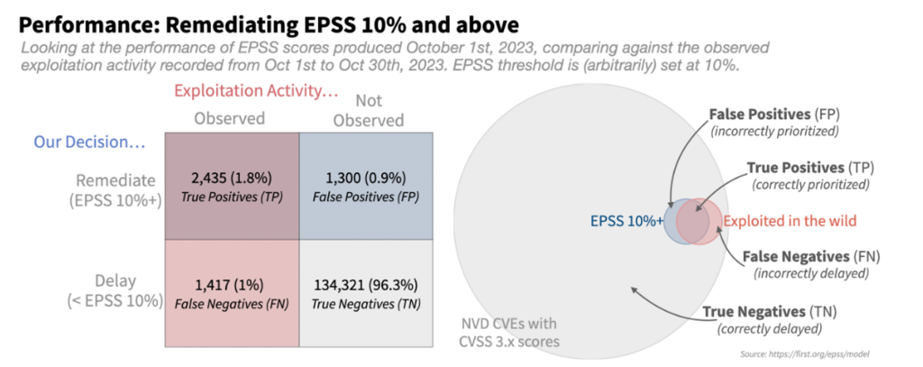 This data reveals that 96% of vulnerabilities with an EPSS score below 10% were not exploited or prioritized for remediation (True Negatives), whereas 1.8% were both exploited and prioritized for remediation (True Positives). This signifies a remarkable decrease in the workload for the security team and a more precise, efficient strategy for handling vulnerability patches. It empowers the remediation teams to concentrate their efforts and resources on the most critical areas within their environment.