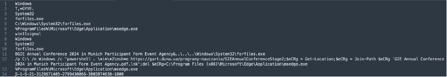 The script then combines Get-Location and Join-Path to create a deceptive link file named GIE Annual Conference 2024 in Munich Participant Form Event Agency.pdf.lnk, which appears like a legitimate PDF but could launch further payloads or commands if clicked. Finally, it uses del to remove traces of this shortcut, suggesting a careful approach to hiding its activities, while also referencing a specific Security Identifier (S-1-5-21-3129671405-2799430066-3803874638-1000), potentially targeting a specific user context. This layered approach showcases how attackers can leverage standard system utilities to create persistent, undetected threats by exploiting directory traversal, external payloads, and file obfuscation.