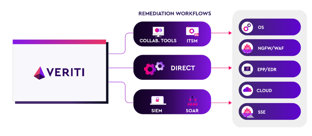 Veriti leverages the same APIs used to fetch all configurations to apply actual remediation guidelines. This involves implementing compensating controls from the OS-level (changing registries on endpoints) to the cloud (SSE and CNAPP/CWPP tools). This comprehensive approach ensures that organizations can: