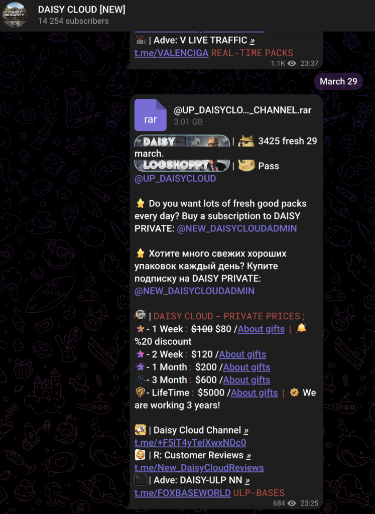 On the 18th of October, 2023, a telegram group was created, exposing sensitive data potentially related RedLine Stealer. Daisy Cloud, the actor behind it, offers competitive pricing for stolen information – including access to financial platforms, cloud services, and even government portals.