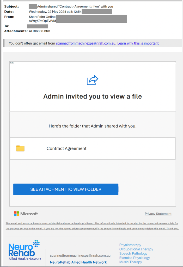 • Content: The emails contained a deceptive link, ostensibly leading to a SharePoint document but actually redirecting recipients to a phishing page designed to harvest credentials.
