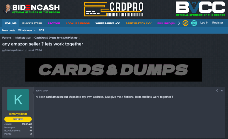 During our research on various hacker forums, we encountered a detailed discussion initiated by a scammer known as “kinavayakam.” This individual was looking for partners to join in his Amazon theft operations. Specifically, he outlined a scheme where he could generate Amazon gift cards using stolen credentials. The term he used was “card Amazon,” referring to the fraudulent creation of gift cards by exploiting compromised accounts.