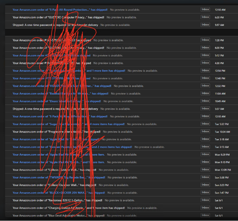 Our research highlighted a specific scam where a hacker, under the pseudonym “kinavayakam,” discussed how they could “card Amazon” – a term referring to the creation of fraudulent Amazon gift cards using stolen credentials. To prove their capabilities, the scammer shared screenshots from their inbox, revealing the ongoing communication and transactions related to these illicit activities.