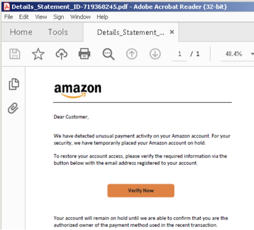 The phishing emails were crafted to appear as legitimate communications from Amazon, complete with familiar branding and language. These emails informed recipients of unusual payment activity or other security concerns with their accounts, urging them to verify their information to prevent account suspension. The attached PDF file, misleadingly named “Details_Statement_ID_<ID number>,” contained a link to a phishing site designed to mimic the Amazon login page.