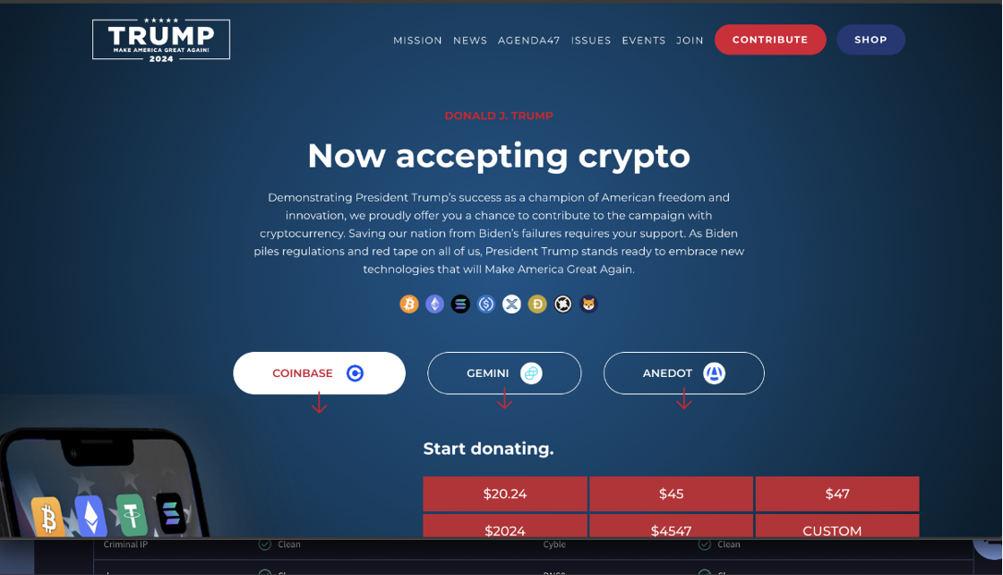 The phishing operation masquerades as an official donation platform for the Trump campaign, claiming to accept various cryptocurrencies. The phishers have created several domains all designed to mimic legitimate donation pages using the WinRed service. These sites employ familiar branding and messaging to lure unsuspecting supporters into making donations.