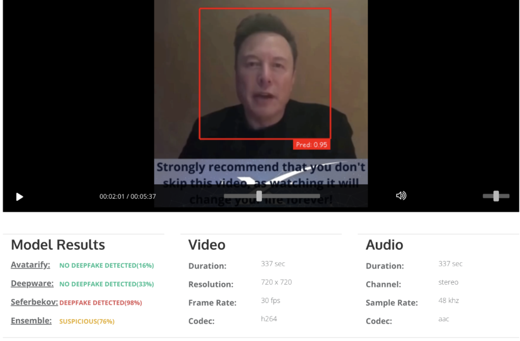 To confirm the authenticity of the video as a deepfake, Veriti Research used Deepware[.]ai powered by Seferbekov’s deepfake detection framework. The tool reported a 98% probability that the video was artificially generated.